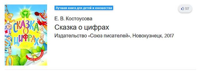 В интернет-голосовании ситуация еще больше нас порадовала. Книга "Сказка о цифрах" набрала 317 лайков! Это 2 позиция из 13! Вот тут - мы вообще дар речи потеряли от счастья!