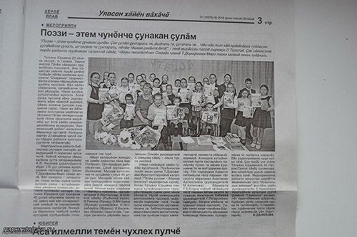 Огромное спасибо Татьяне Арянской за фото статьи из номера Херле-Ялав Урмарской-Районной-Газеты! Статья посвящена подведению итогов третьего ежегодного конкурса чтецов «Над Арей рекою-2018» в Урмарском районе Чувашской Республики по чтению отрывков из прозаических, стихотворных и иных произведений поэта, члена Союза Чувашских писателей Татьяны Юрьевны Дорофеевой-Миро (Татьяна Арянская). В ней упомянуты и члены жюри конкурса. В их числе и Елена Костоусова.