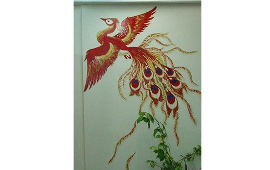 На стене я рисовала Жар-птицу. Гуашь. Этот рисунок наносился, как постоянный. Я добавила в гуашь строительный ПВА. Будьте осторожны. Если вы переборщите с клеем, то слой после высыхания станет прозрачным. Что бы защитить роспись от повреждений, я нанесла сверху несколько слоев лака. Так же я работала при росписи по дереву.