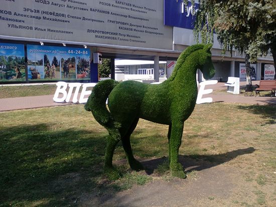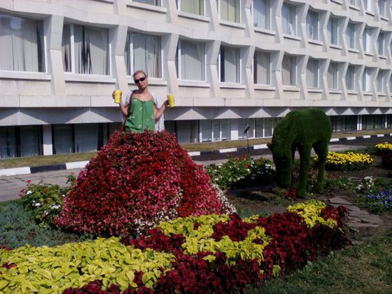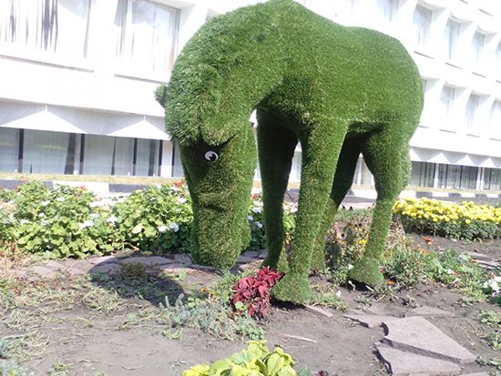 Больше всего мне понравились скульптуры лошади и ослика. Лошадь удачна сама по себе, а ослик жутко забавный. Кроме того, рядом с осликом создан маленький уголок для фотографирования. Это меня заинтересовало. Люди подошли к делу с фантазией. Вы увидите на фотографии клумбу, которая сужается к верху. В нее можно войти, встать на подставочку и, получается будто вы в шикарной юбке, усыпанной живыми цветами. Эта композиция находится недалеко от дворца бракосочетаний и зоны отдыха. Любой с легкостью может сделать фото на память. Низкий поклон создателям композиции.